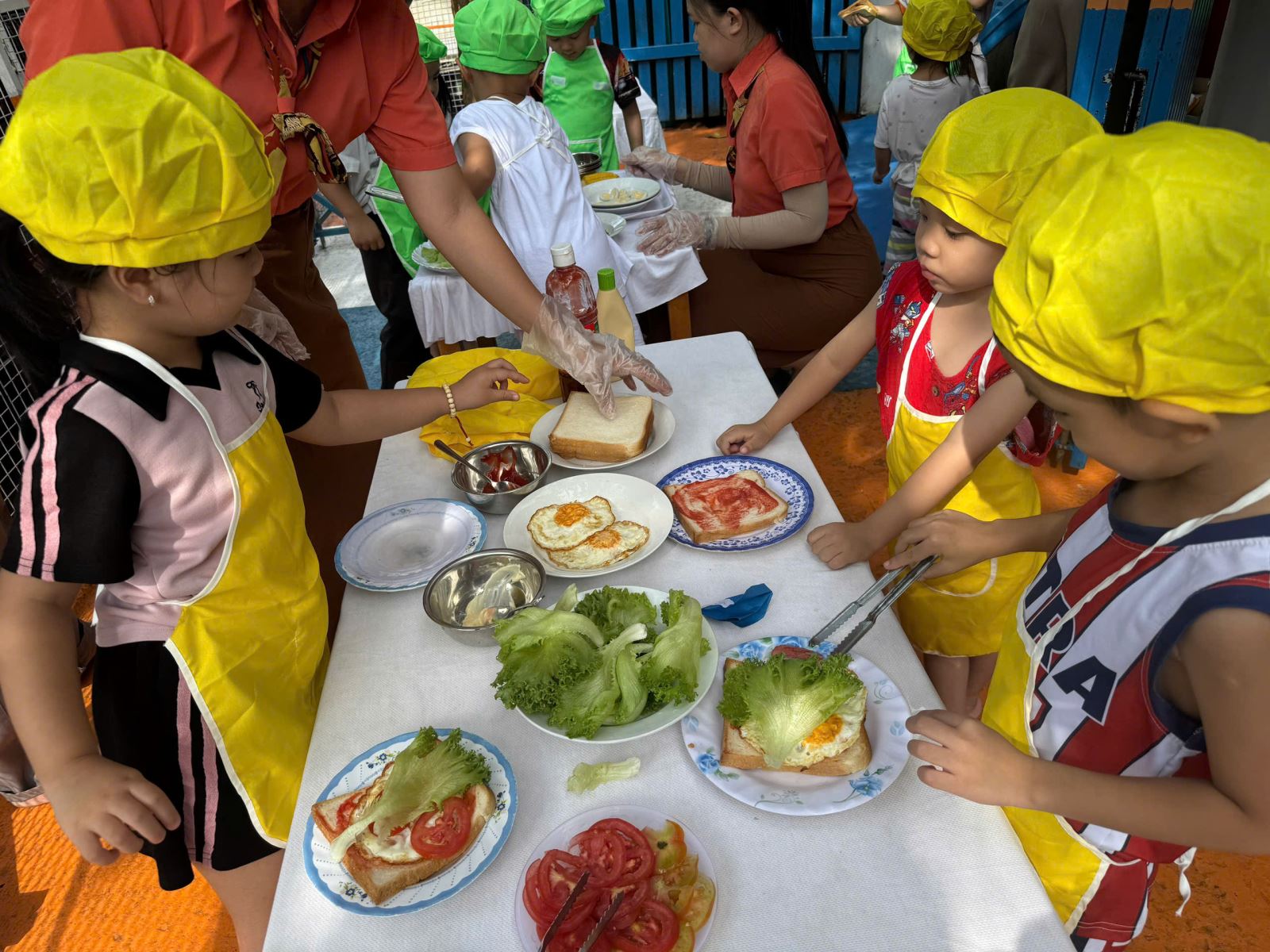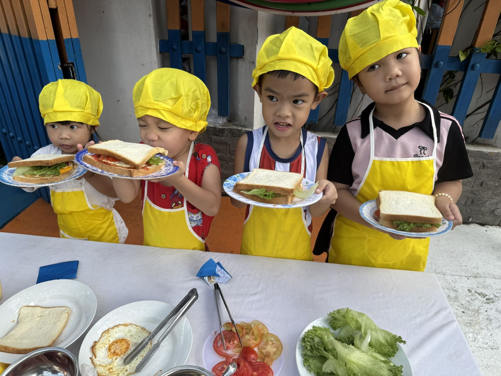 Tổ chức hoạt động để trẻ tìm hiểu lợi ích của các loại thực phẩm khác nhau đối với cơ thể: Bánh mì sandwich kẹp thịt, trứng...