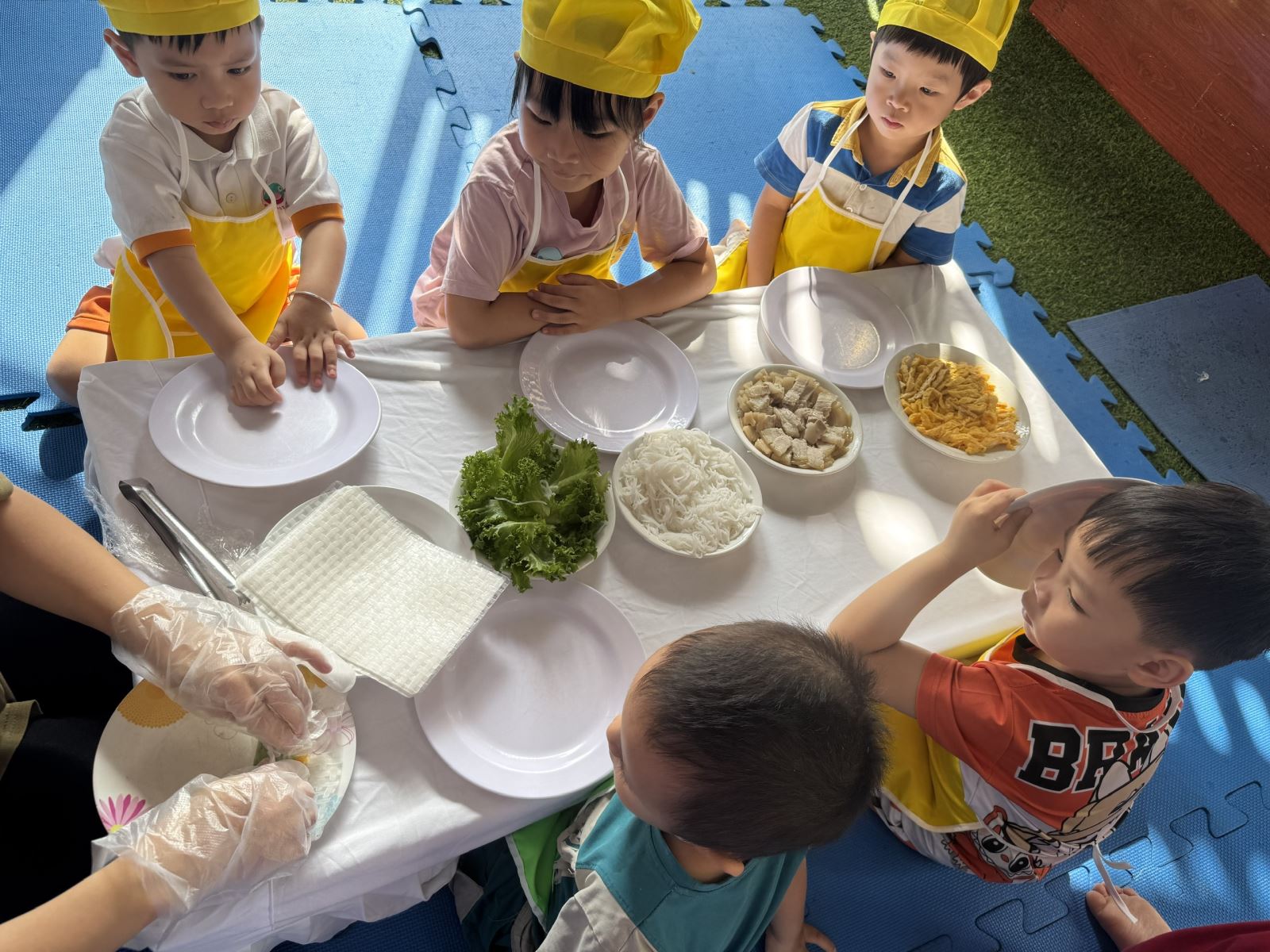Cho trẻ làm quen với việc chuẩn bị bữa ăn đơn giản như: Rau xà lách, thịt luộc, bánh tráng, trứng chiên xắt lát mỏng, trẻ tự tin và hoàn thành món gỏi cuốn.